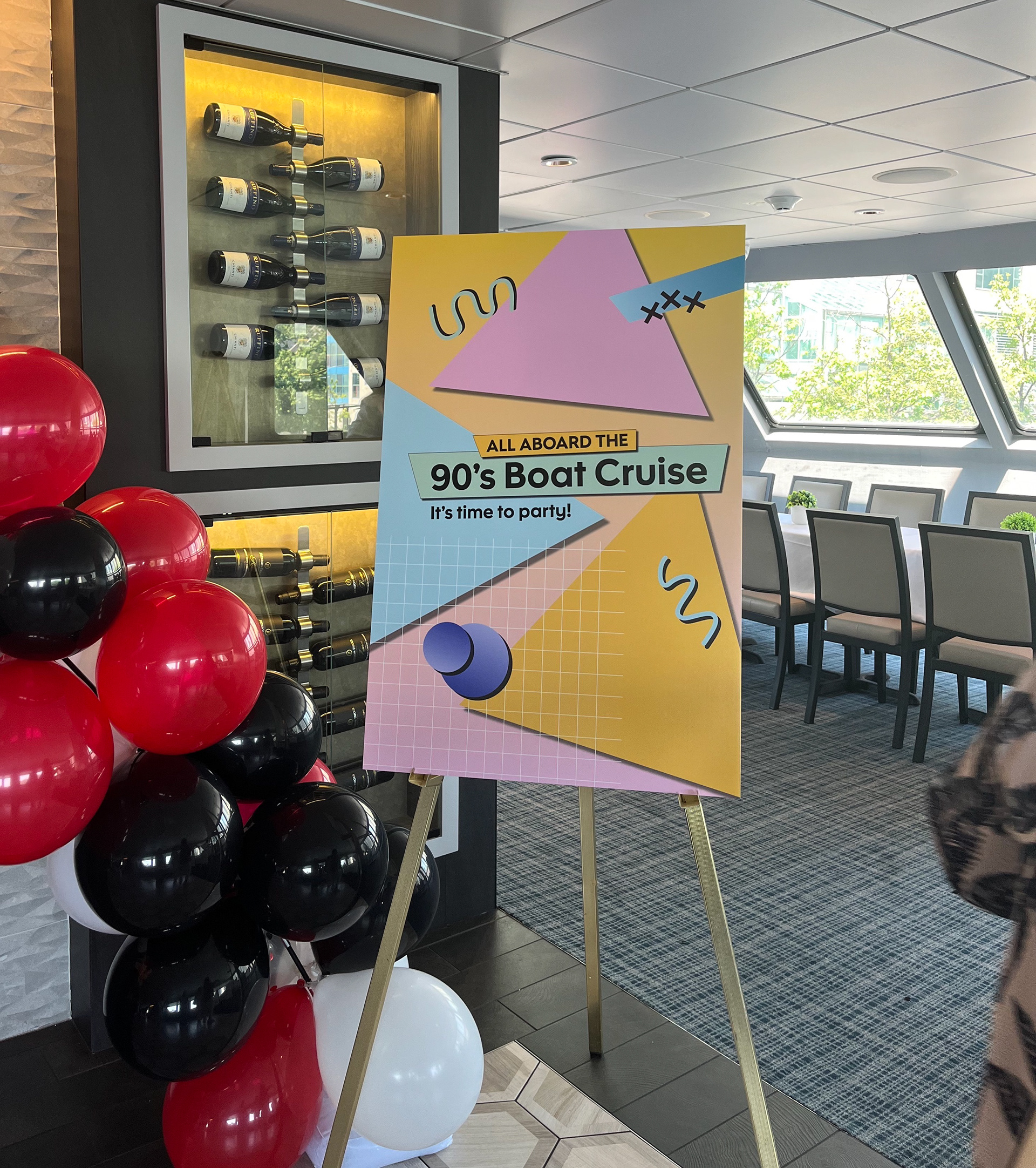 For this year’s Marketing Summer Social, we set sail back to the 90's with a themed boat cruise. Think neon windbreakers, cassette tapes, and boy band bops. I designed a suite of event visuals that brought the throwback theme to life across the boat, using bold colours, nostalgic patterns, and a retro flair to capture all the vibes from the dance floor to the game table.