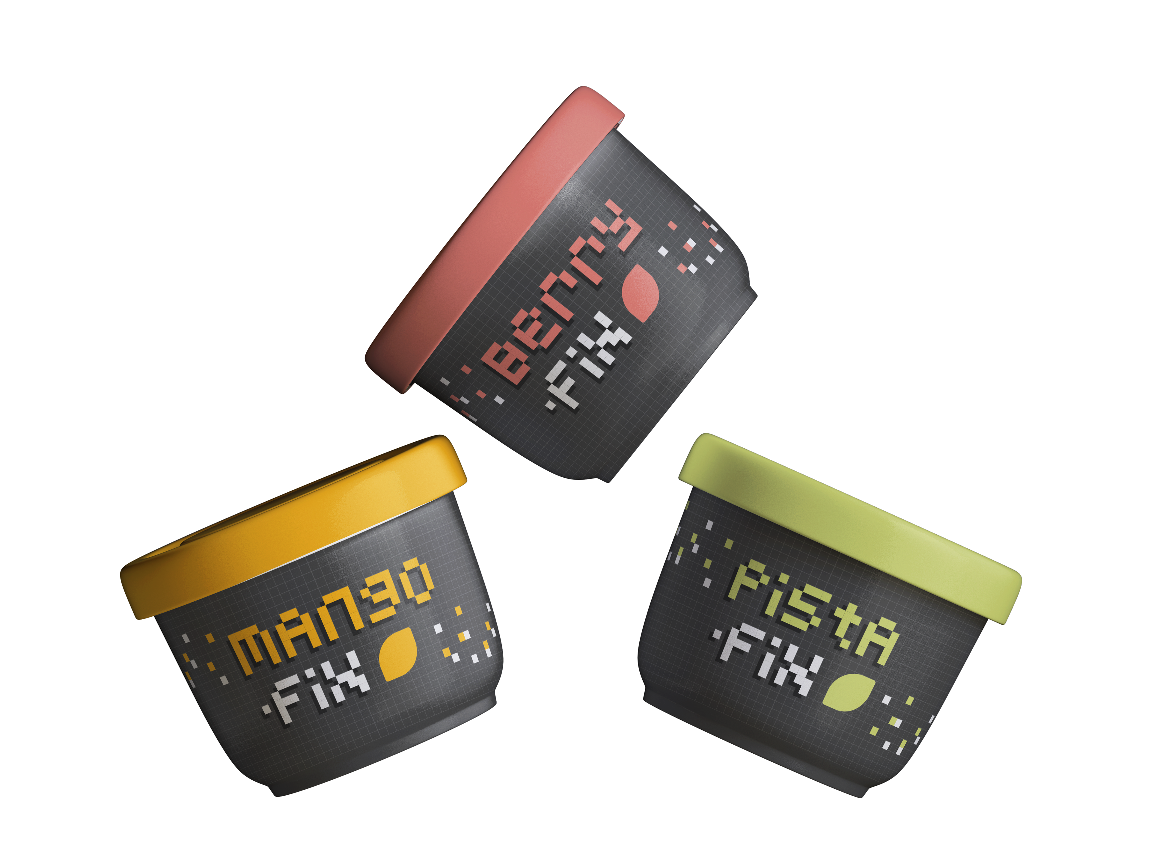 I made a custom pixel font and a cubed pattern to give the packaging a fun, digital pop. The deep charcoal background makes those vivid flavour colours (like that mango gold or berry pink) hit even harder.