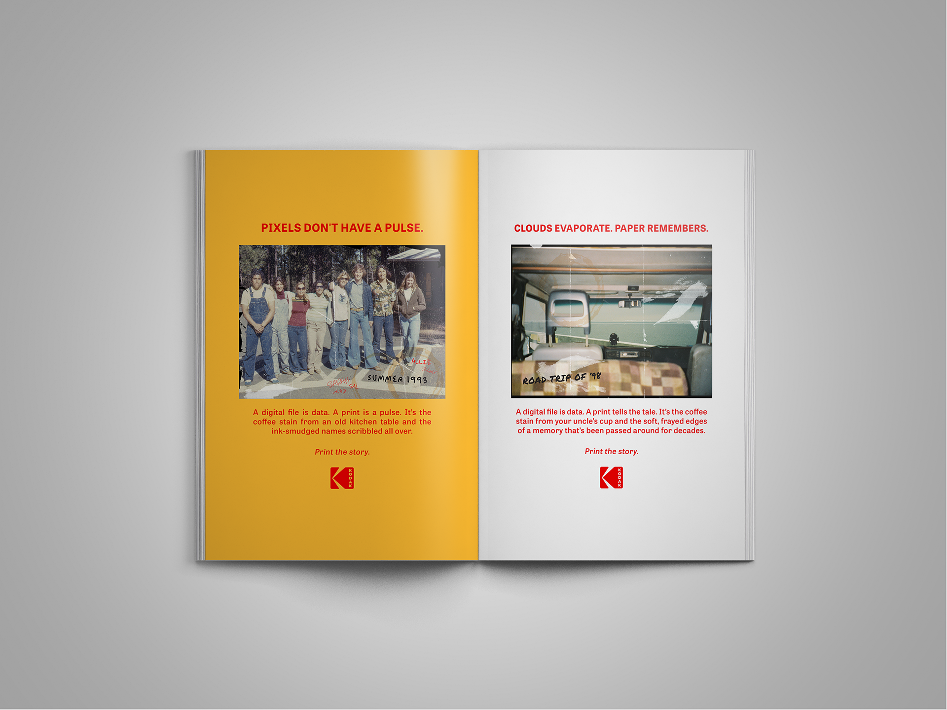 Let’s be real: your cloud storage is where memories go to be forgotten. Inspired by my family's own collection, this campaign for Kodak is a reality check for the digital age, proving that pixels are just that. I leaned into the messy and human side of photography, celebrating the coffee stains, frayed edges, and scribbled notes that data just can't replicate. Because hard drives fail and clouds evaporate, but paper lives to tell the tale.